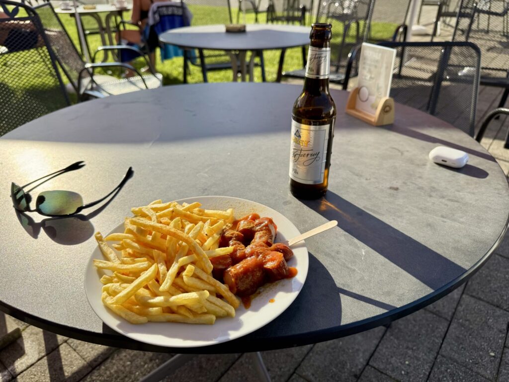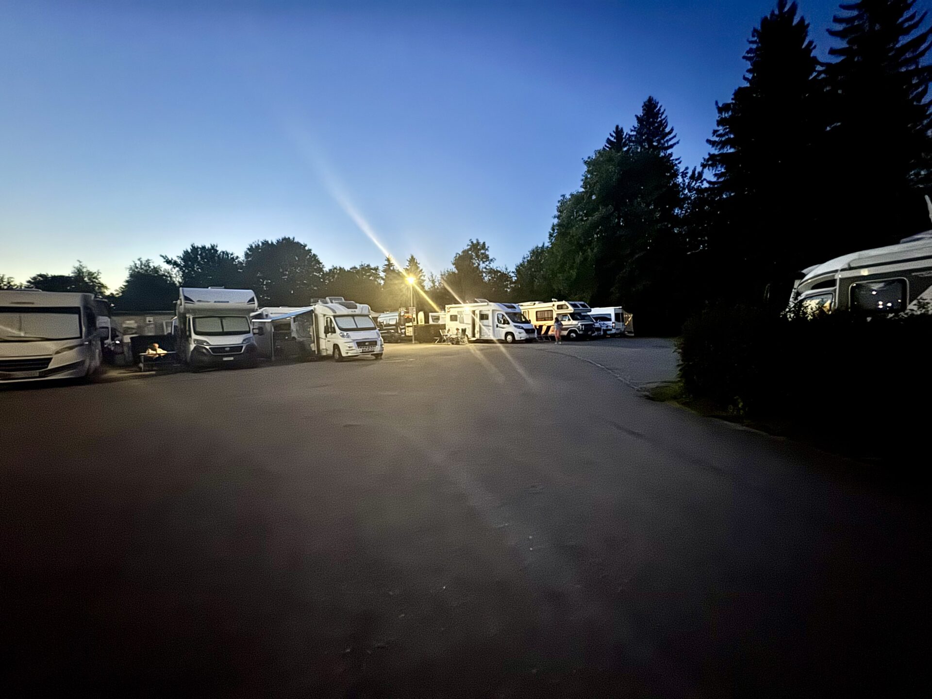 Ich schnappe das Womo und mache einen Trip in die Umgebung. Die Stadt Weingarten nimmt mir am Stellplatz Festplatz einen Euro ab, bleibt aber die Wasserlieferung schuldig. Daher gehts nochmals zu Ruth auf den Hof zurück um Wasser zu bunkern. Der erste angefahrene Stellplatz in Wolfegg ist um 16:30 Uhr schon komplett voll, eine Station weiter in Kisslegg ergattere ich aber noch einen Platz. Kulinarisches Highlight: Menü 1 im Freibadkiosk – Currywurst mit Pommes…
