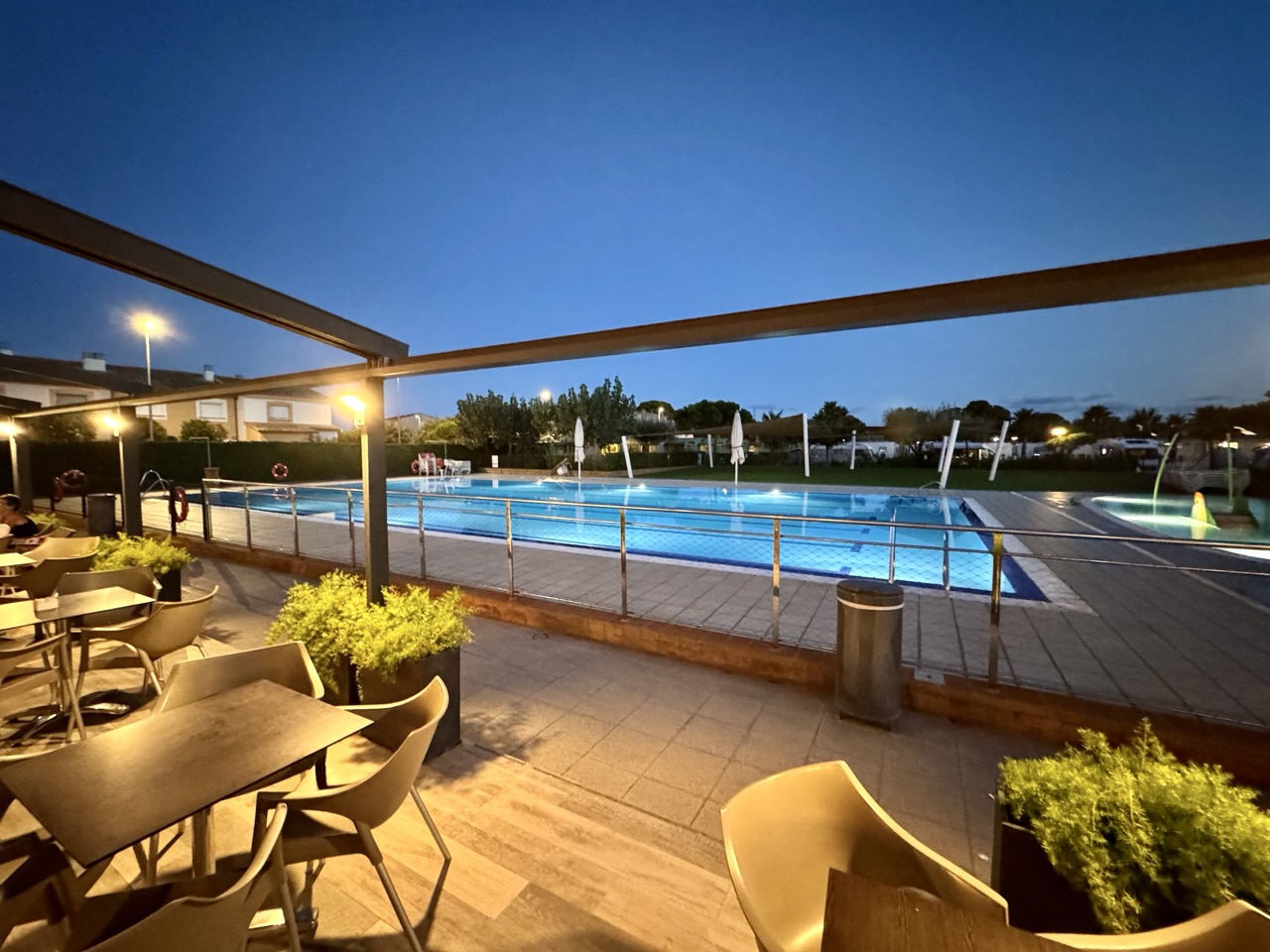 Ziel ist l’Estartit. Der anvisierte Campingplatz La Sirena ist leider voll, so landen wir auf dem von Oranjes okkupierten Nachbarplatz Emporda. Nach dem Aufstellen des Mobiles auf der Parzelle testen wir die Gastronomie direkt am Pool.