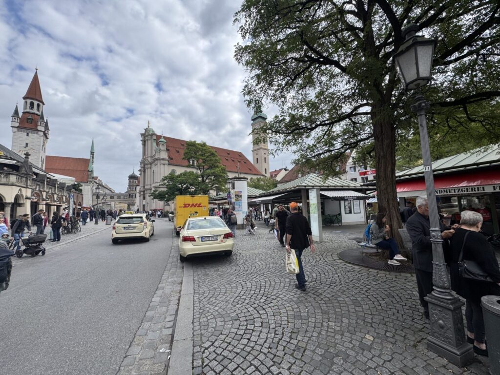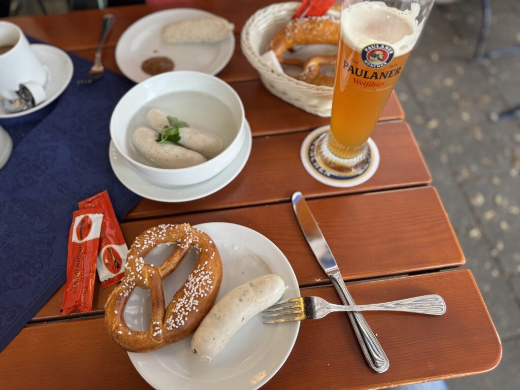 Mit den Fahrrädern gehts in die Stadt. Das Restaurant am Grossmarkt hat leider Betriebsferien, also weiterradeln Richtung Zentrum. Auch das Hofbräuhaus mag uns vor 11 noch nichts verkaufen also gibts die Weisswurst halt auf dem Viktualienmarkt. An der Isar entlang führt der Weg zurück zur Flosslände. Dort kommen die ersten Flosse an, dazu gibts Getränke und eine Bratwurst auf die Hand vom Flaucher-Kiosk. Abends entschliessen wir uns dann nochmals mit dem Radl zum „Alten Wirt“ zu fahren.