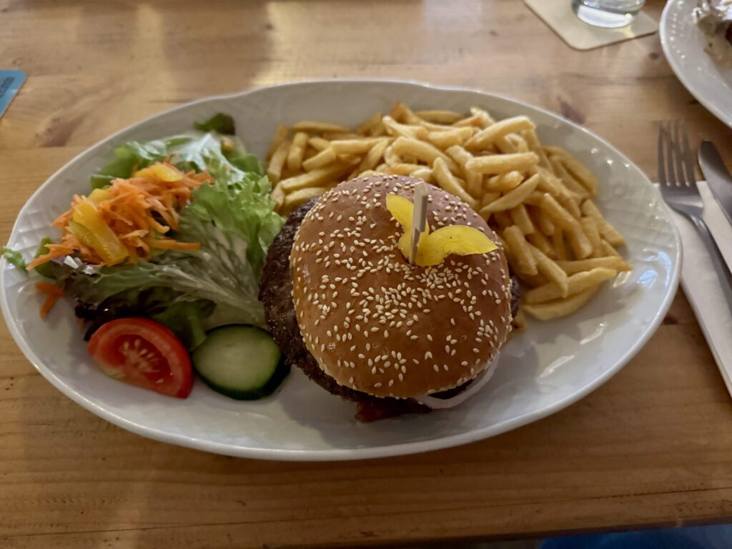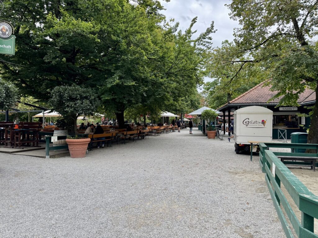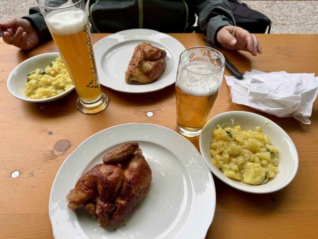 Samstag ist es temperaturmässig etwas frischer, trotzdem satteln wir den Roller ab und fahren Richtung Schloss Nymphenburg. Danach quer durch die Stadt in den Biergarten der Waldwirtschaft. Es gibt Hendl mit Kartoffelsalat. Zum Kaffee gibts danach Kuchen auf der Parzelle. Abends mit dem Radl noch auf was zu Trinken und ne Kleinigkeit in der temporären Almhütte des Bartl an der alten Einfahrt des Campings.